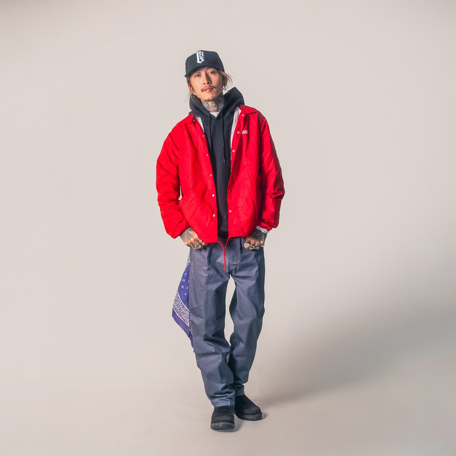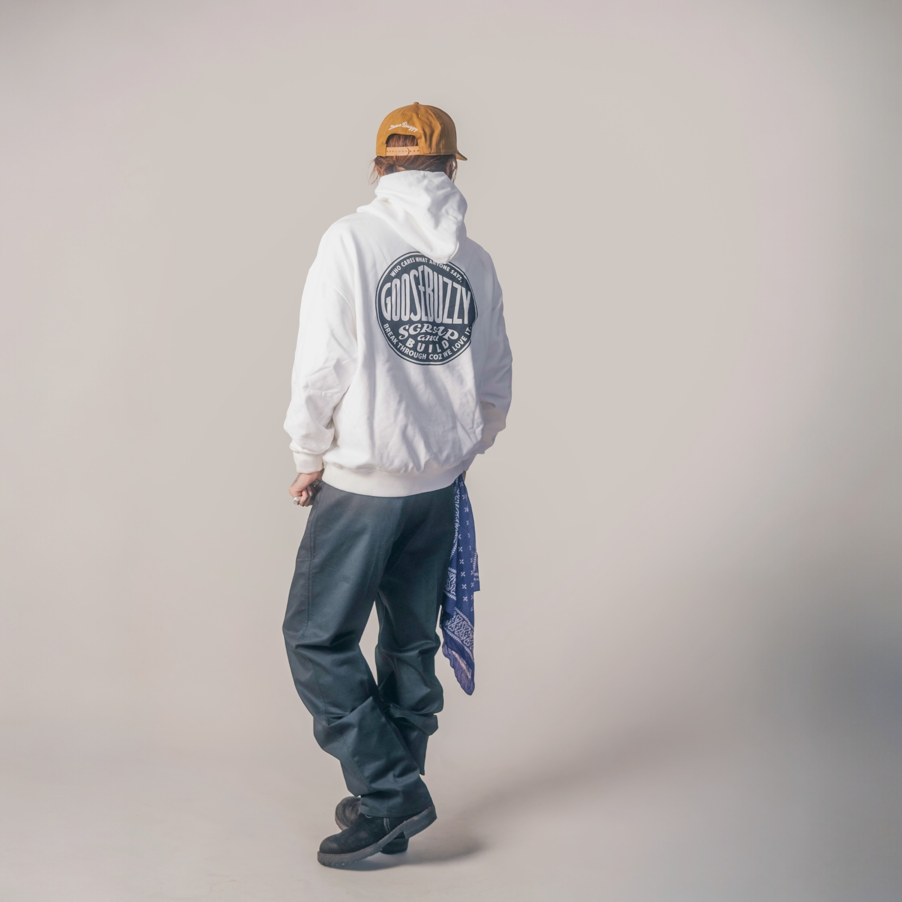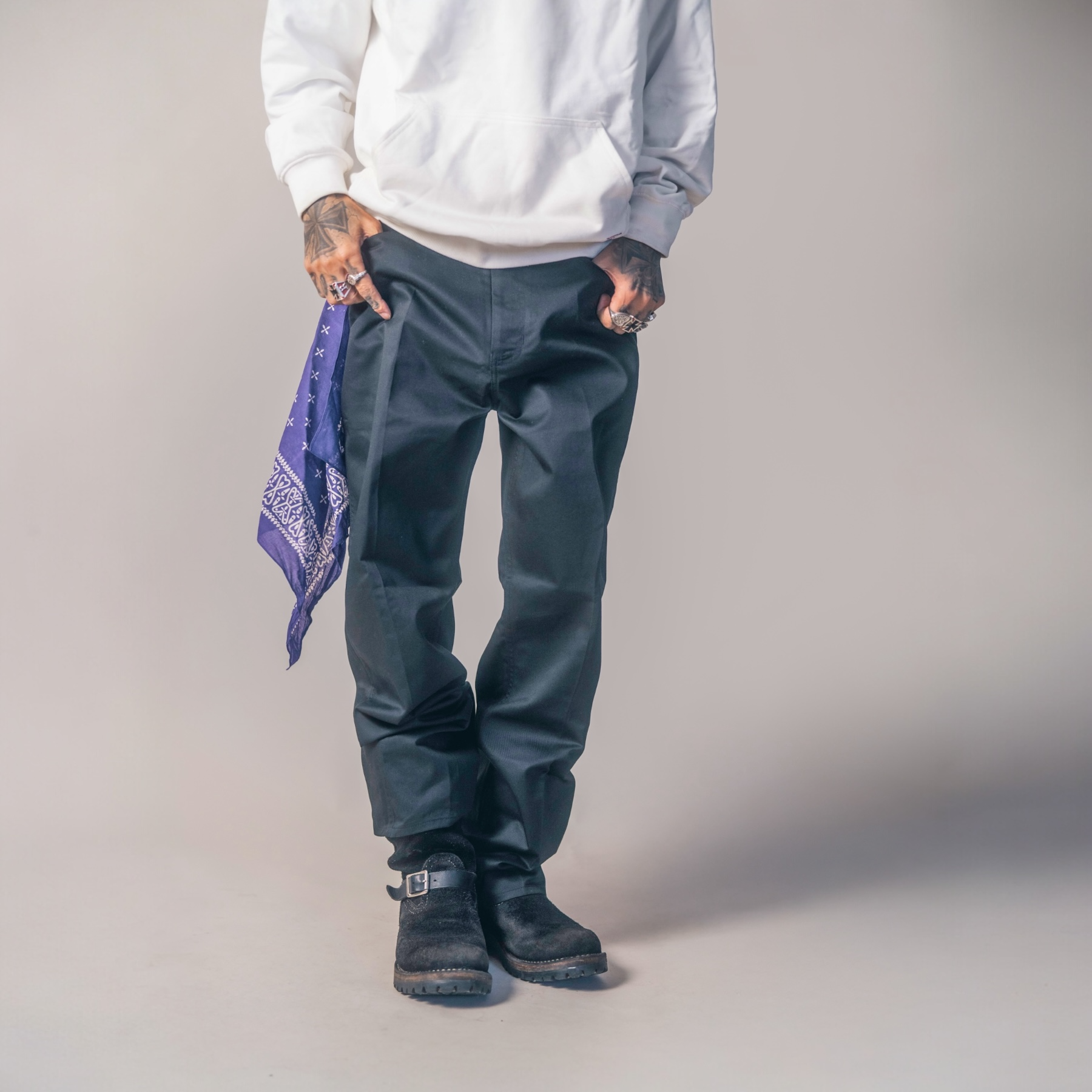 T/Cクロスを使用したワークパンツ。ハリのある生地感、巻縫い仕様など、タフなワークディテールを備えた一本。パープルのオリジナルバンダナ(GSBZ BANDANA)が付属します。