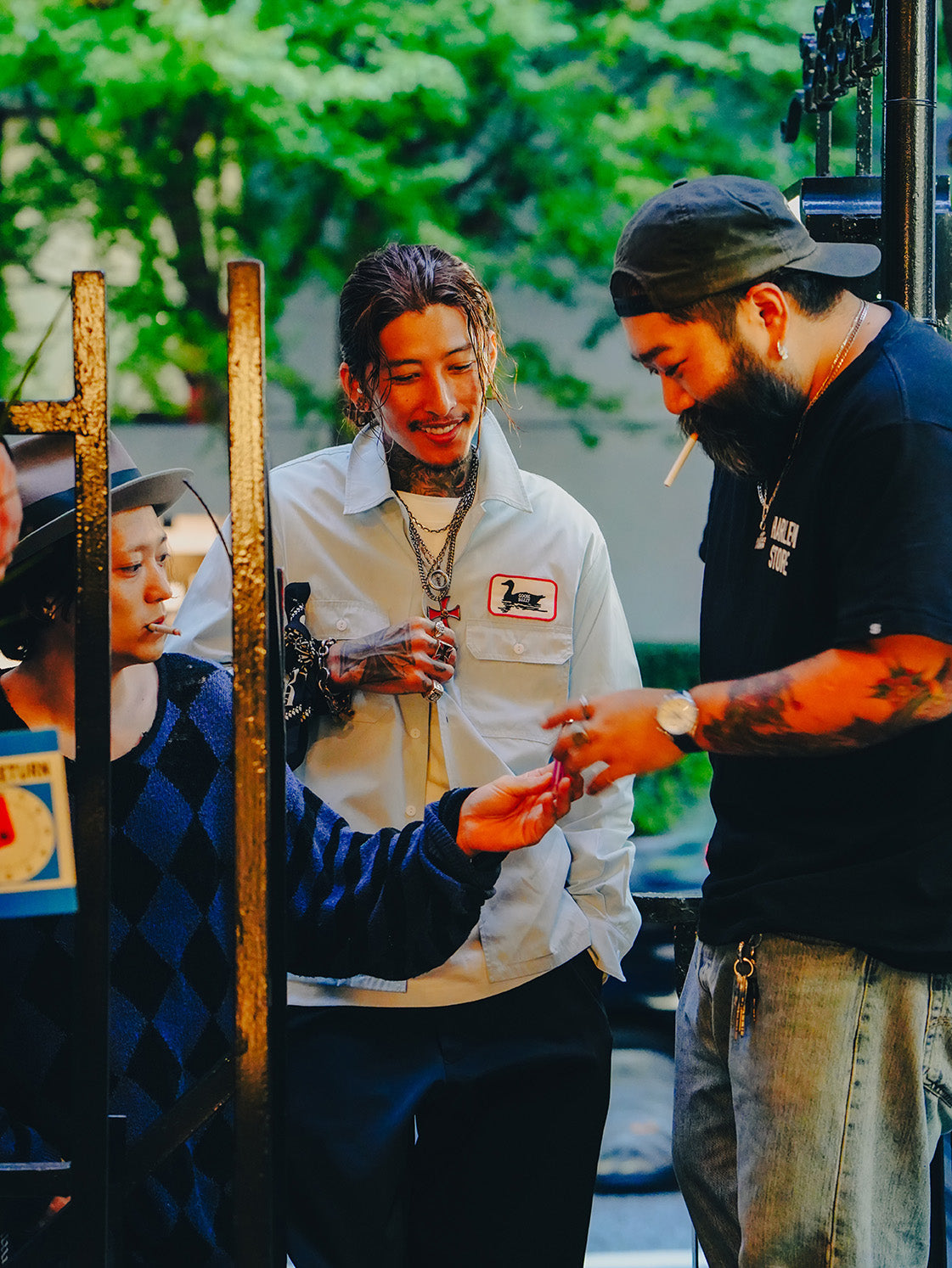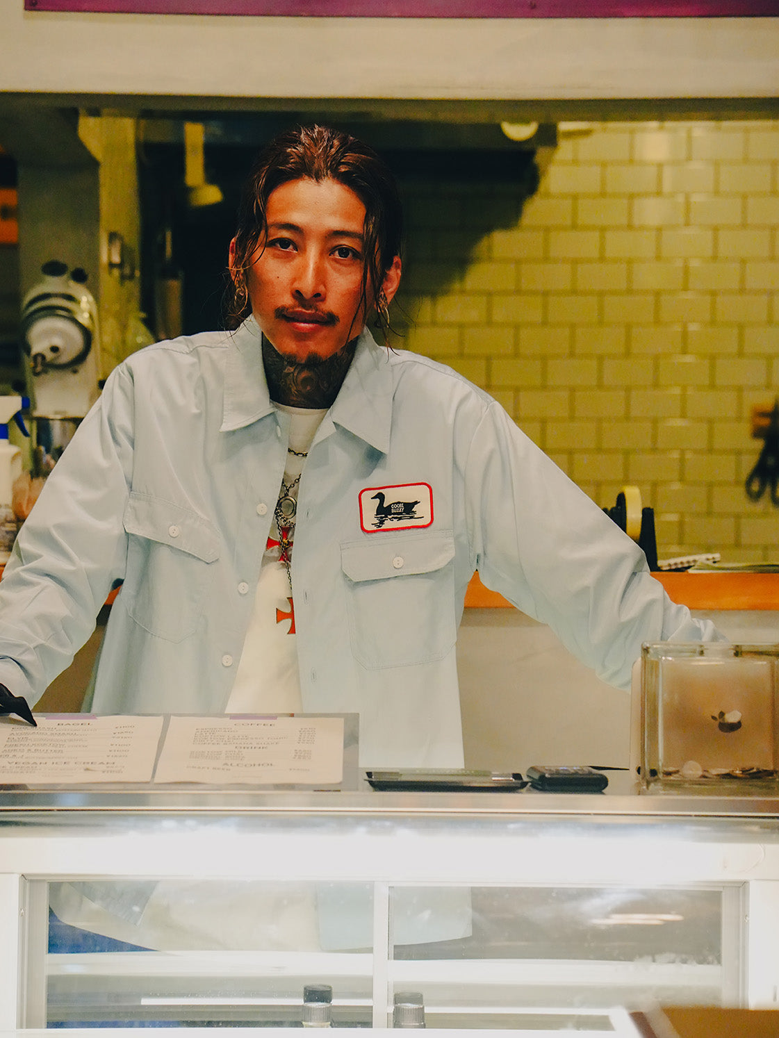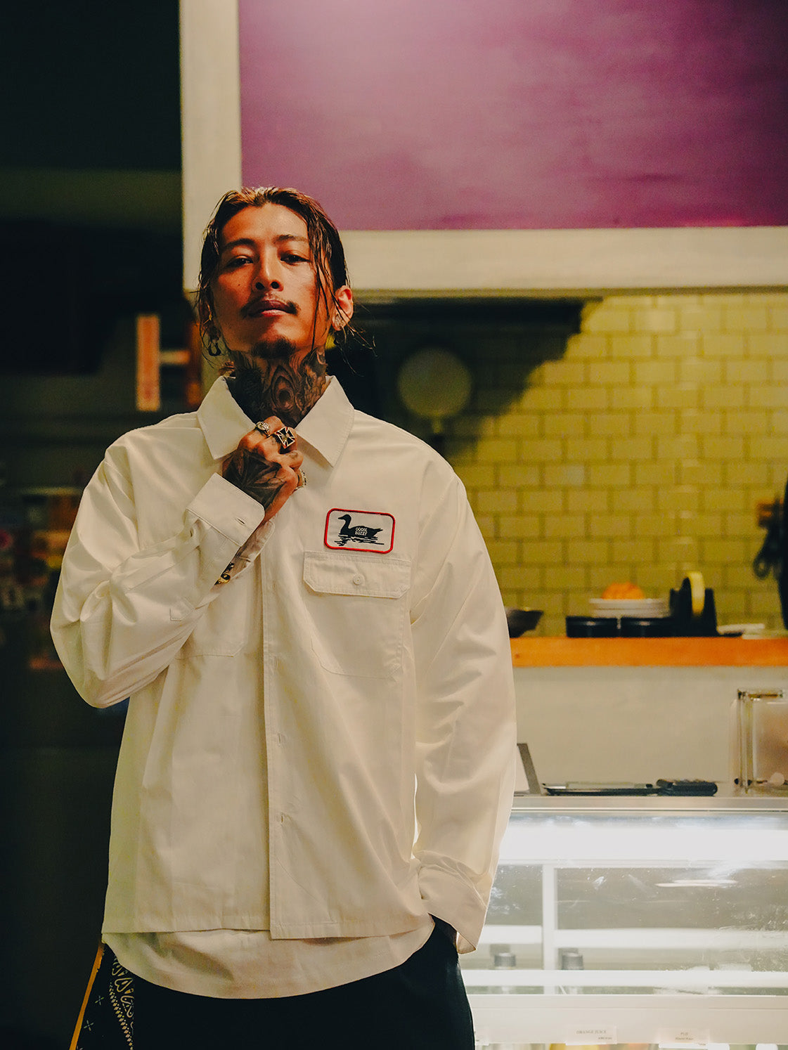 オリジナル刺繍ワッペン付きワークシャツ。ウォータープルーフ(防水性)のT/C生地を採用。